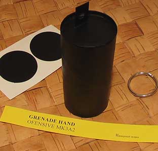 Инструкция к изготовлению: (пишу, как для тупых, перед всеми острыми заранее извиняюсь) Расходные материалы: 1. петарда 2. горох 3. канцелярский клей 4. офисная бумага 5. клей «Момент» 6. нитки 7. спички 8. пластиковая бутылка 9. терка для воспламенения спичек 10. заводное кольцо 11. краска зеленя (авто эмаль в болоне) 12. TV или радио и т.п., просто не помешает можно и BEER, все просто! 1.Изготовление воспламенителя терочного типа а) Изготовление чеки На полоску пластика от бутылки шириной 8 мм длинной 70 мм наклеить клеем «Момент» полоску терки, так что бы осталось свободное пространство на пластиковой пластинки для крепления заводного кольца. Шилом проделать отверстие в свободном пространстве пластиковой пластинки и вставить заводное кольцо. Примечание: перед склейкой прочти инструкцию на упаковке. б) при помощи ниток закрепить 3-6 спичек вдоль петарды, таким образом, чтоб головки спичек находились в непосредственной близости от друг друга и от цветной головки петарды. Примечание: если расстояние от спичечных головок до цветной головки петарды кажется большим для перескока пламени, то можно или уменьшить толщину стенки петарды в этом месте или заполнить пространство между головками спичек и петарды смесью серы со спичек и лака и т.п. в) закрепляем чеку на петарде, для этого прижимаем чеку теркой к спичечным головкам, оборачиваем в один слой полоской офисной бумаги на всю длину петарды и обматываем нитками, по всей длине петарды не сильно и не много, а у головок спичек посильней. Примечание: закреплять чеку при помощи скотча (не клейкой стороной внутрь) не рекомендую далее поймете (наверное) почему. В нашем исполнении надежность такого запала очень высока (по моим подсчетам более 96%) если у вас не так сочувствую, с опытом придет… 2. ИЗГОТОВЛЕНИЕ КОРПУСА (хотя я бы так его не назвал) из офисной бумаги вырезается полоска шириной равной длине петарды, и длиной зависящей от мощности петарды(это определяет диаметр корпуса).Склеить полоску так, чтоб получился цилиндр (внахлест равный примерно 10мм). Поставить цилиндр на лист офисной бумаги. 3.СБОРКА а) в цилиндр опустить петарду(кольцом вверх), удерживая петарду по центру цилиндра засыпать внутрь цилиндра горох. Придать правильную цилиндрическую форму, проверить, ровно ли расположена петарда. б) САМОЕ ГЛАВНОЕ взять твёрдой рукой бутылочку с КАНЦЕЛЯРСКИМ КЛЕЕМ и не заливая в терочный воспламенитель, по каплям, пропитать всю гранату до тех пор пока с низу не начнет слегка протекать клей. Протекший клей равномерно размазать кисточкой вокруг нижней части гранаты, с целю приклеит ее к той офисной бумаге на которой она стоит(с этой же целю можно несколько раз повернуть гранату не отрывая от листа на котором она стоит). Проверить весь ли горох приклеился сверху. Выключить музыку(TV) и лечь спать. Следующим вечером (это вовсе не значит, что это клей так долго сохнет, просто вечером обычно на это найдется время) вырезать гранаты с листа к которому они приклеены и покрасить. Примечание: для придания большего эстетического вида можно вырезать из той же бумаги кружок по радиусу равный гранате и приклеить его сверху, так гороха вообще не будет видно. При проклейке лучше, чтоб весь горох был связан клеем, но если в середине гранаты что-то не проклеелось - ни чего страшного. Изготавливать лучше партиями, а не штучно, выполня