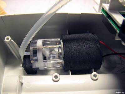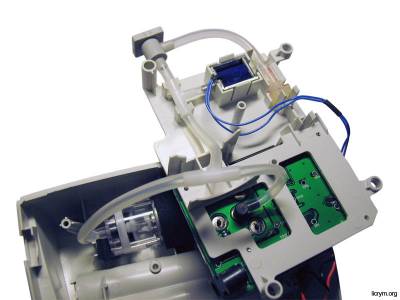 Вся пневматика тонометра отчетливо видна. В нижней половине корпуса цилиндр – компрессор. Воздух, нагнетаемый компрессором в систему трубок, попадает в датчик давления, вентиль, дроссель и штуцер.
