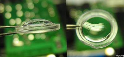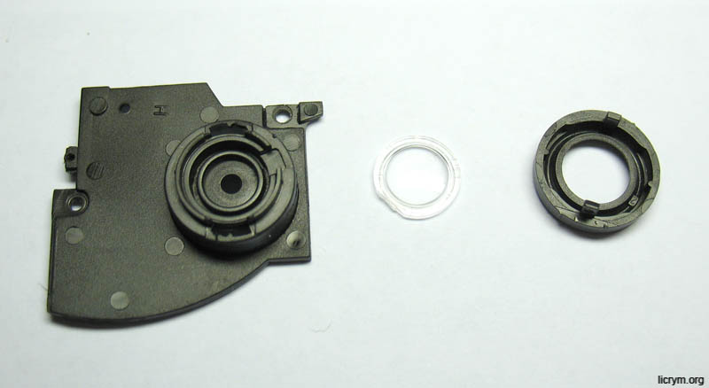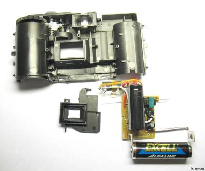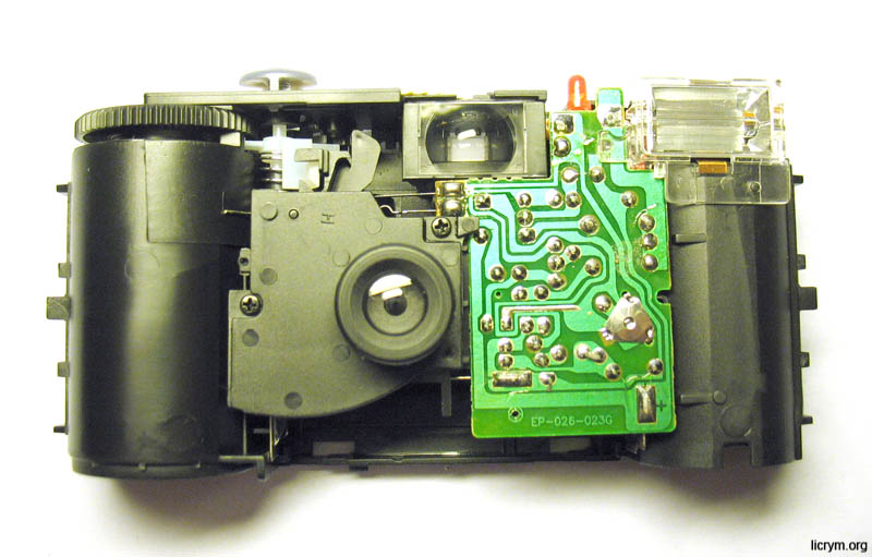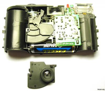 Объектив фотоаппарата простой - однолинзовый. Линза выполнена из оптического полистирола. Видна также диафрагма - она уменьшает количество проходящего света, что увеличивает выдержку и требуемую светочувствительность но увеличивает глубину резкости и уменьшает искажения оптики.