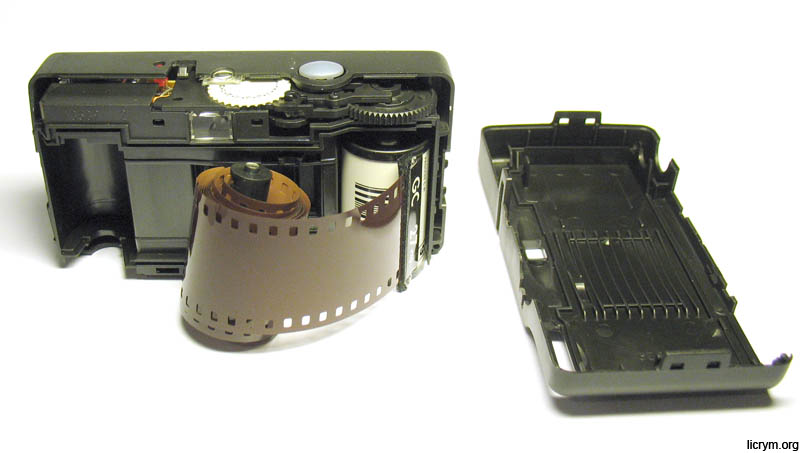 Само собой при вскрытии вся пленка оказалась засвечена. В данном фотоаппарате пленка изначально намотана на ось слева и по мере фотографирования сматывается в контейнер справа.
